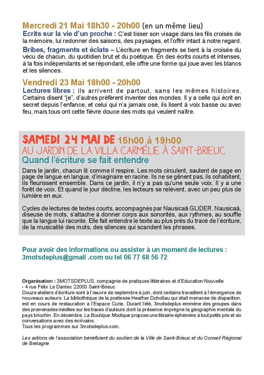 Réservations souhaitées : tel 06 77 68 56 72. Le détail du programme sur 3motsdeplus.com