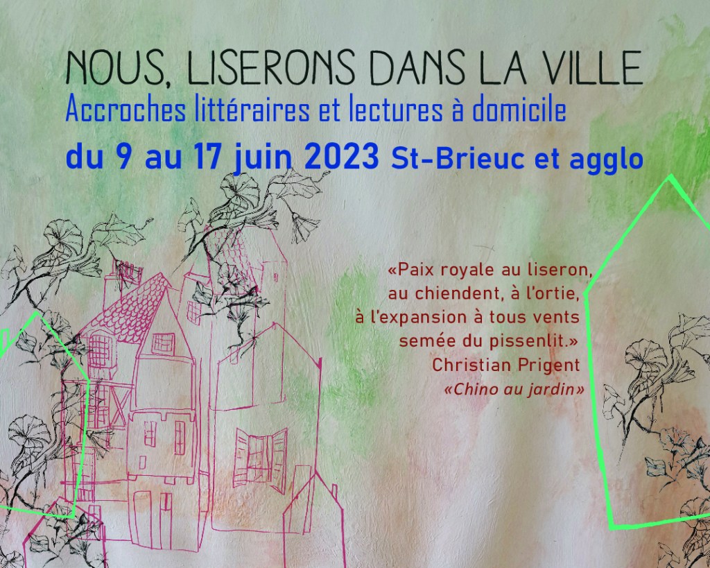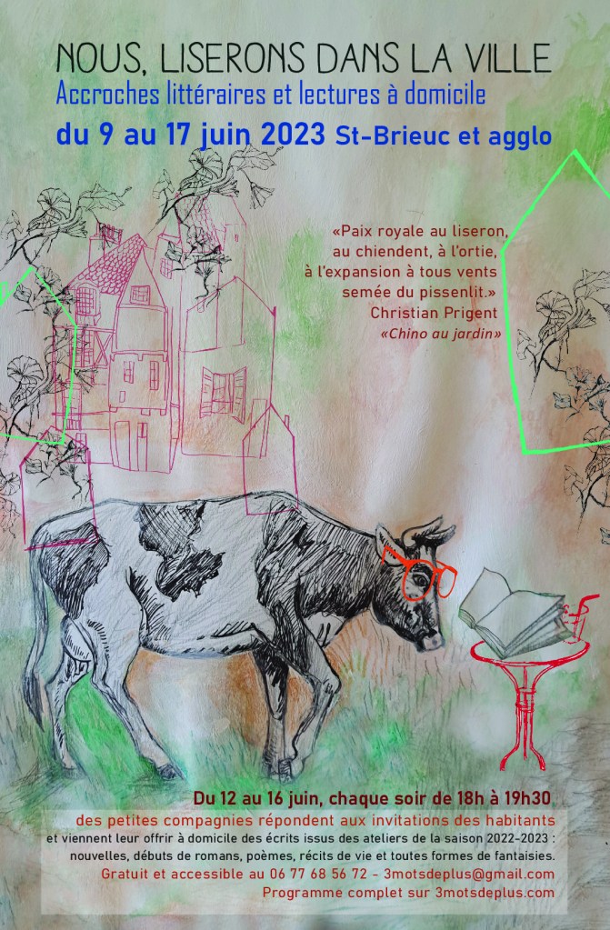 Chaque soir du 12 au 16 juin, de 18h à 19h30 – Nous irons lire chez vous. Des petites compagnies de lecteurs issus de 12 ateliers d’écriture briochins, répondent aux invitations des habitants. Les accueillants rassemblent leurs amis et voisins. La prestation est simple et gratuite. Il suffit de quelques chaises et d’un petit espace pour lire, en intérieur ou en plein air. Les écrits réalisés durant la saison 2022-2023 : nouvelles, débuts de romans, poèmes, récits de vie et toutes formes de fantaisies, sont offerts à domicile. Pour accueillir, téléphoner au 06 77 68 56 72 ou par mail : 3motsdeplus@gmail.com